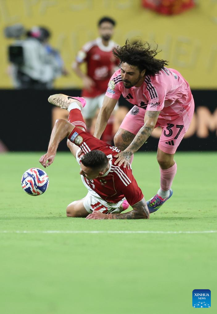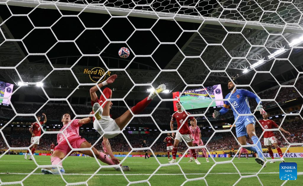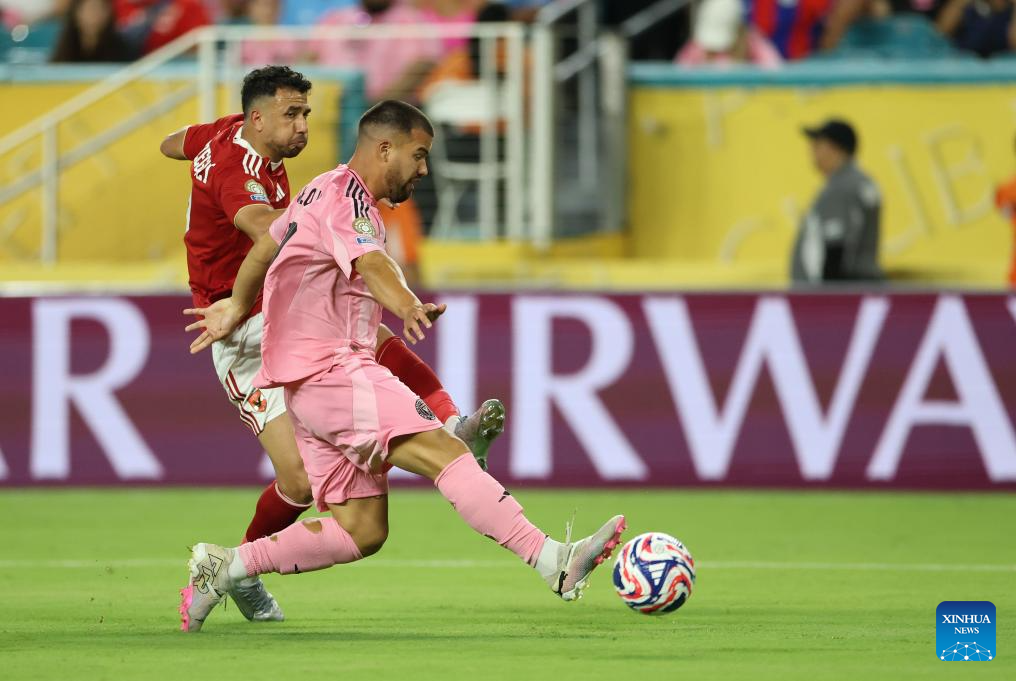 Mohamed Ali Ben Romdhane (front) of Al Ahly shoots during the opening match between Inter Miami CF of the United States and Al Ahly of Egypt at the FIFA Club World Cup 2025 in Miami, the United States, on June 14, 2025. (Xinhua/Li Ming)
