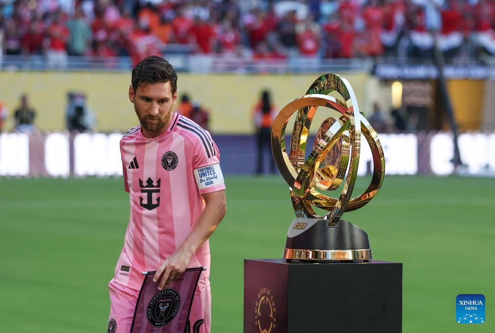 Lionel Messi of Inter Miami CF walks past the trophy before the opening match between Inter Miami CF of the United States and Al Ahly of Egypt at the FIFA Club World Cup 2025 in Miami, the United States, on June 14, 2025. (Xinhua/Li Ming)