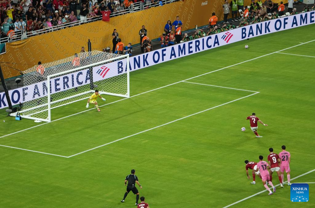 Inter Miami CF's goalkeeper Oscar Ustari (L) saves a penalty from Al Ahly's Trezeguet during the opening match between Inter Miami CF of the United States and Al Ahly of Egypt at the FIFA Club World Cup 2025 in Miami, the United States, on June 14, 2025. (Xinhua/Huang Zongzhi)