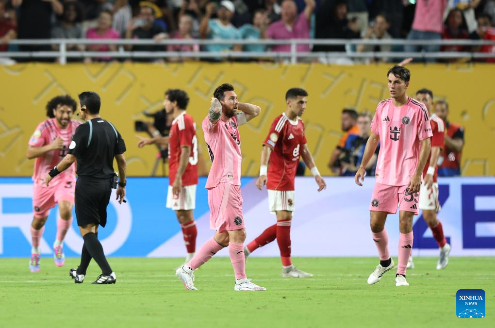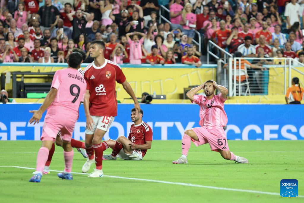 Lionel Messi (C) of Inter Miami CF reacts after missing a shot during the opening match between Inter Miami CF of the United States and Al Ahly of Egypt at the FIFA Club World Cup 2025 in Miami, the United States, on June 14, 2025. (Xinhua/Li Ming)