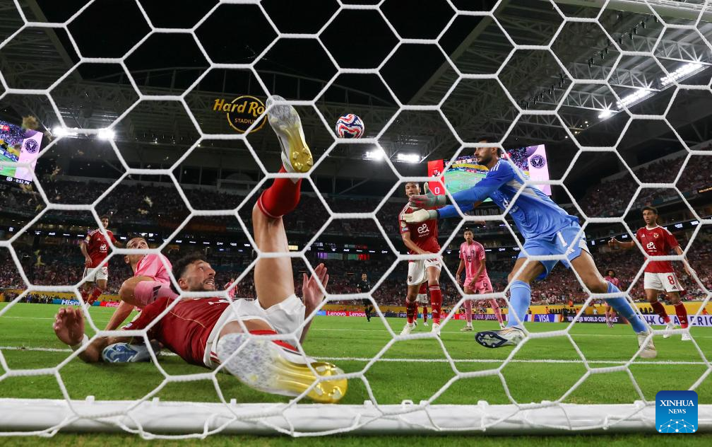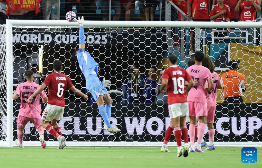 Al Ahly's goalkeeper Mohamed El Shenawy (3rd L) makes a save during the opening match between Inter Miami CF of the United States and Al Ahly of Egypt at the FIFA Club World Cup 2025 in Miami, the United States, on June 14, 2025. (Xinhua/Li Ming)
