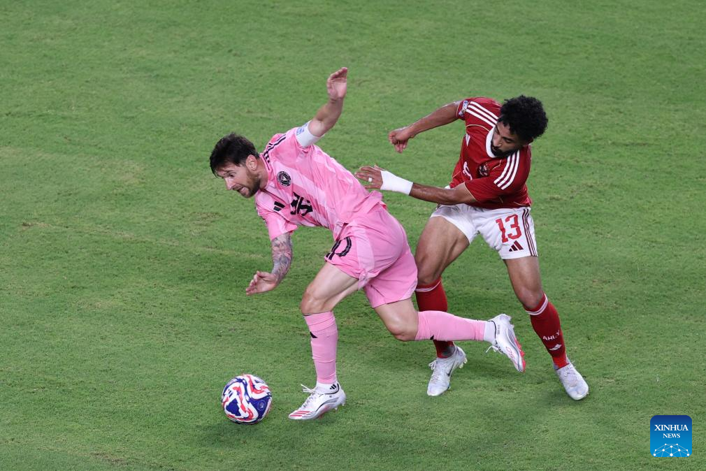 Lionel Messi (L) of Inter Miami CF vies with Marwan Attia of Al Ahly during the opening match between Inter Miami CF of the United States and Al Ahly of Egypt at the FIFA Club World Cup 2025 in Miami, the United States, on June 14, 2025. (Xinhua/Xu Zijian)