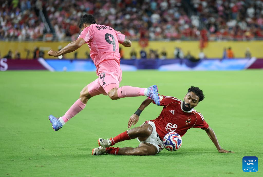 Hussein El Shahat (R) of Al Ahly vies with Luis Suarez of Inter Miami CF during the opening match between Inter Miami CF of the United States and Al Ahly of Egypt at the FIFA Club World Cup 2025 in Miami, the United States, on June 14, 2025. (Xinhua/Li Ming)
