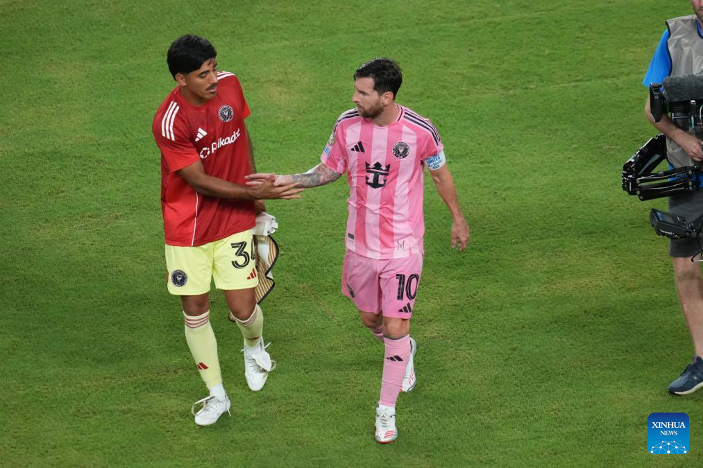 Lionel Messi (R) of Inter Miami CF reacts with teammate Novo after the opening match between Inter Miami CF of the United States and Al Ahly of Egypt at the FIFA Club World Cup 2025 in Miami, the United States, on June 14, 2025. (Xinhua/Huang Zongzhi)