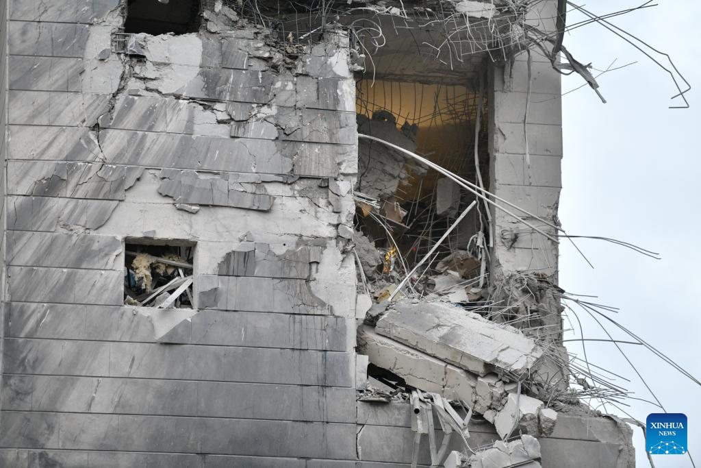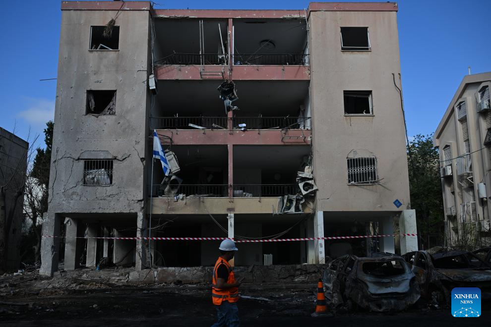 (250616) -- PETAH TIKVA, June 16, 2025 (Xinhua) -- This photo taken on June 16, 2025 shows a building damaged in an Iranian missile attack in Petah Tikva, central Israel. Iran launched a new pre-dawn missile attack on Israel on Monday, killing at least eight people and wounding dozens, Israeli officials said, as the four-day conflict triggered by an Israeli surprise assault intensified.