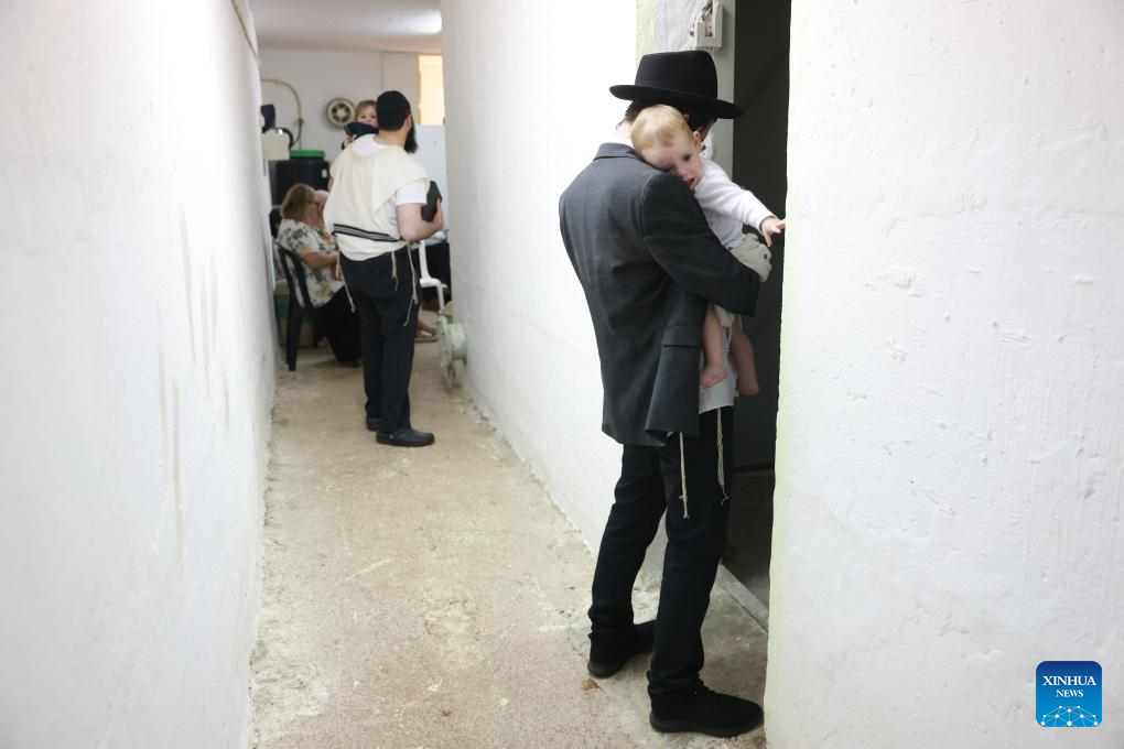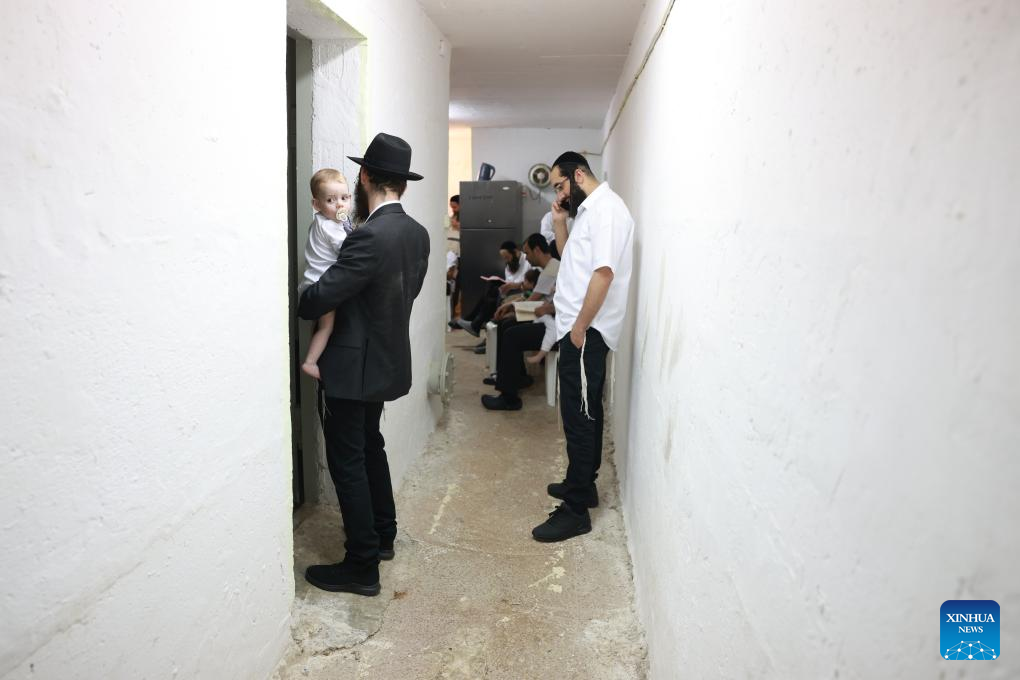 (250616) -- SAFED, June 16, 2025 (Xinhua) -- People are pictured inside a shelter during an airstrike in the northern city of Safed in Israel, June 15, 2025. (David Cohen/JINI via Xinhua)
