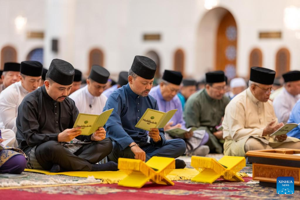 Brunei's Crown Prince and Senior Minister at the Prime Minister's Office Haji Al-Muhtadee Billah attends the new Islamic year prayer at Jame'Asr Hassanil Bolkiah mosque near the capital, Bandar Seri Begawan, Brunei, June 26, 2025. Brunei's Crown Prince and Senior Minister at the Prime Minister's Office Haji Al-Muhtadee Billah on Thursday evening graced the end of the Islamic year and new Islamic year 1447 Hijrah prayer ceremony, local media reported. (Information Department of Brunei's Prime Minister's Office/Handout via Xinhua)