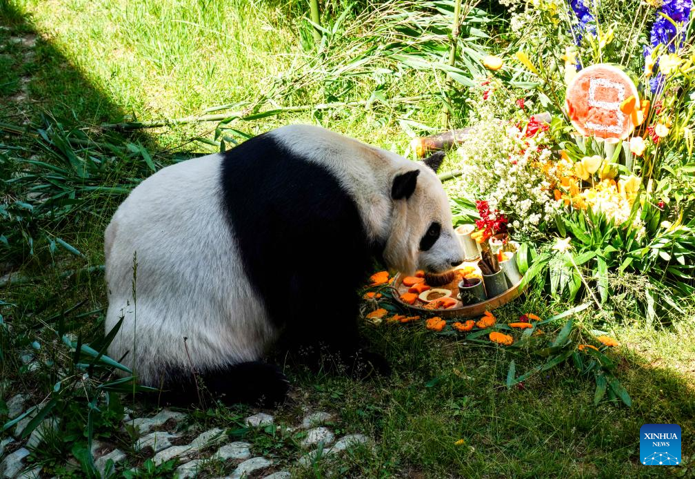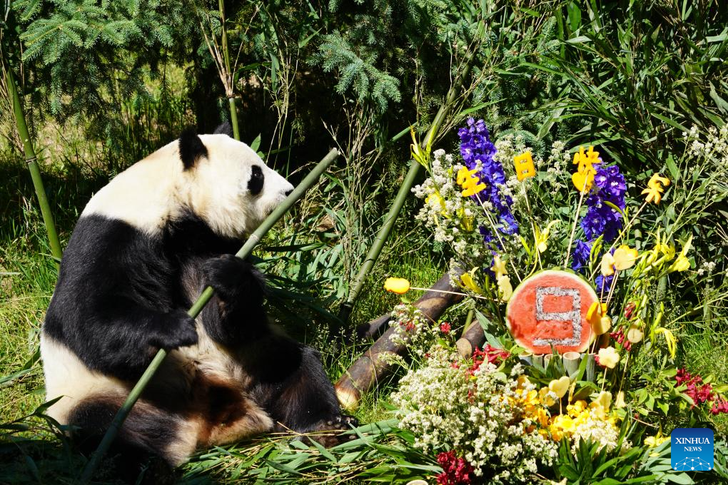Giant panda Qi Guo enjoys its birthday treat at a panda house in Xining, northwest China's Qinghai Province, June 28, 2025. Two giant pandas Qi Guo and Yuan Man enjoy the celebration of their 9th birthday here on Saturday. (Xinhua/Geng Huihuang)