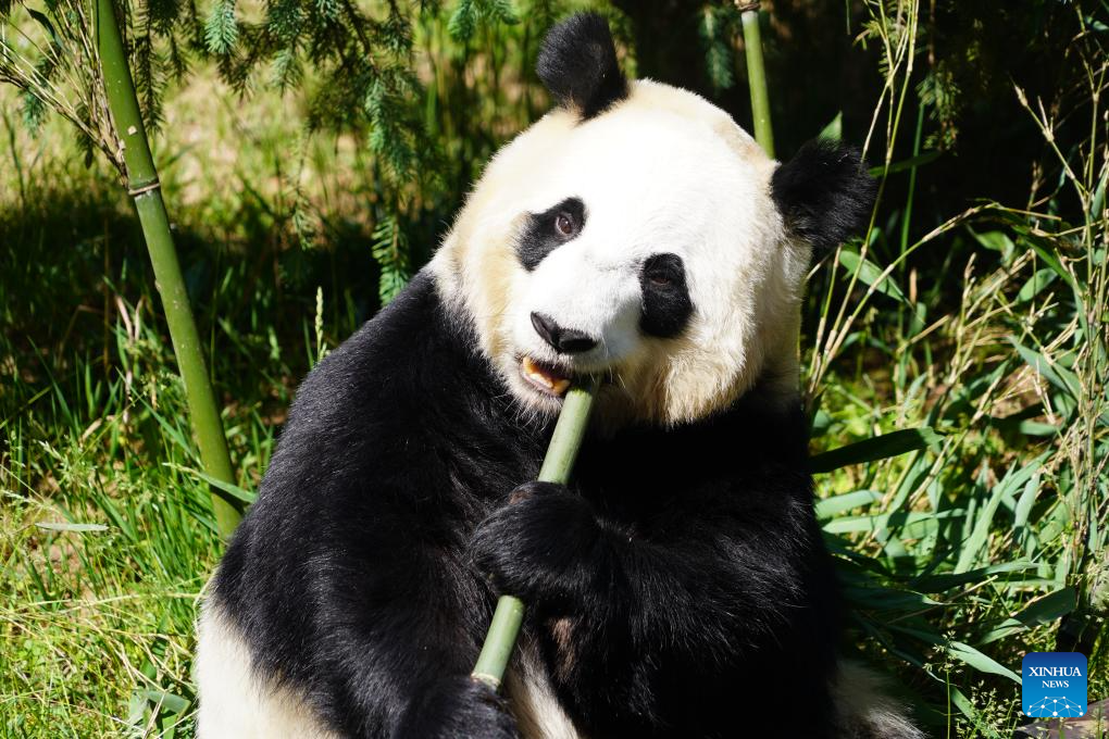Giant panda Yuan Man eats bamboo at a panda house in Xining, northwest China's Qinghai Province, June 28, 2025. Two giant pandas Qi Guo and Yuan Man enjoy the celebration of their 9th birthday here on Saturday. (Xinhua/Geng Huihuang)