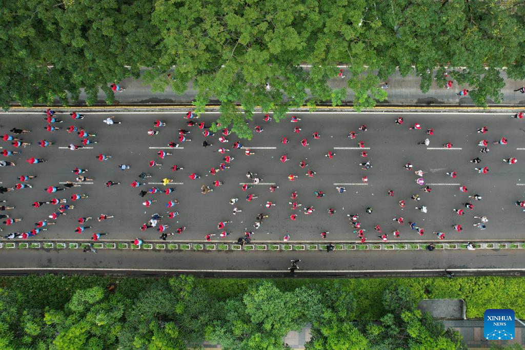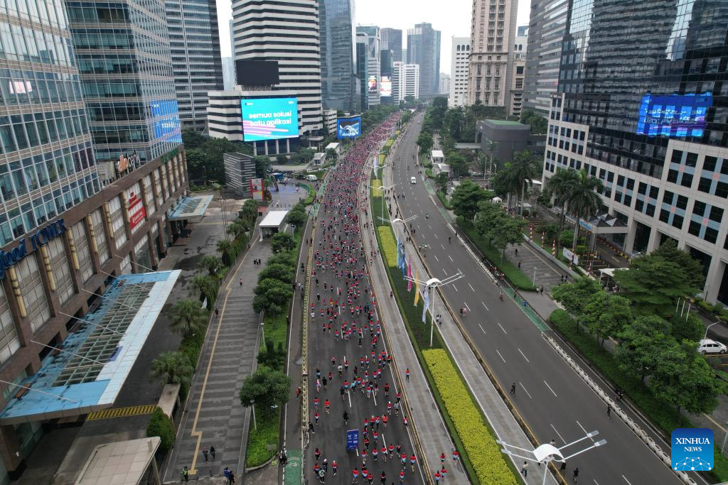 A drone photo shows participants running during the Jakarta International Marathon 2025 in Jakarta, Indonesia on June 29, 2025. (Xinhua/Veri Sanovri)