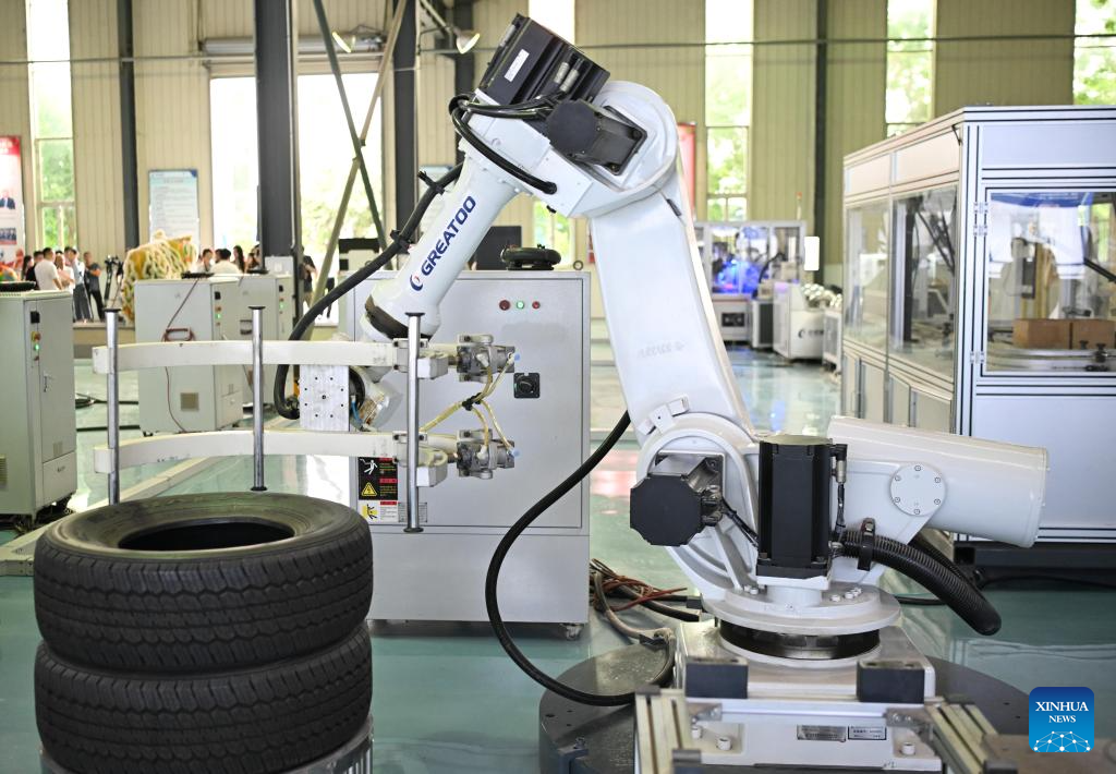 This photo taken on June 29, 2025 shows an automated tire transporting robot at Greatoo Intelligent in Jieyang, south China's Guangdong Province.