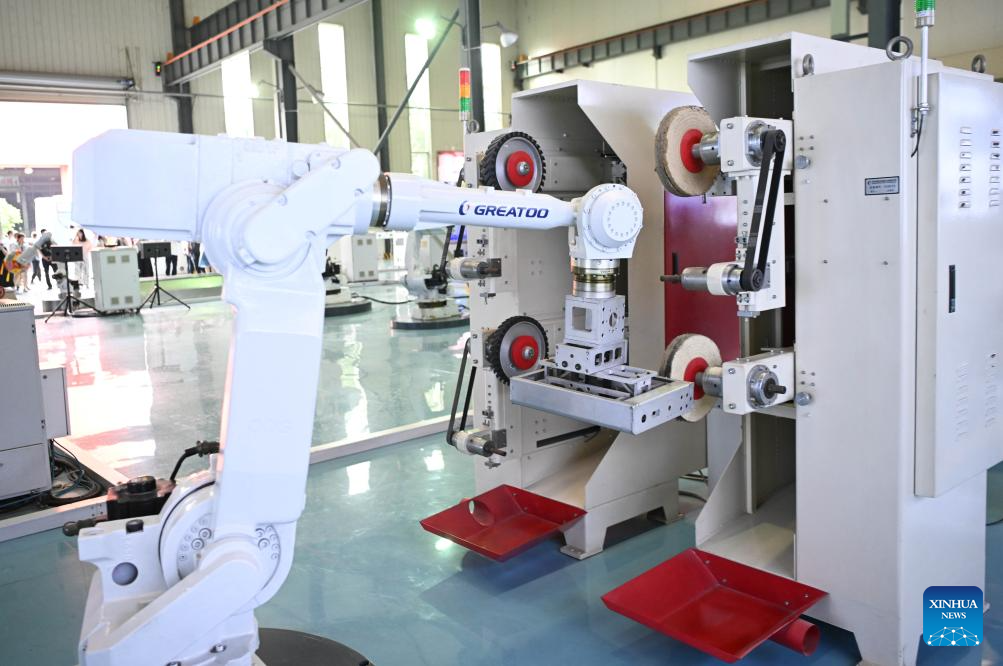 This photo taken on June 29, 2025 shows a robotic arm grinding a unit at Greatoo Intelligent in Jieyang, south China's Guangdong Province.