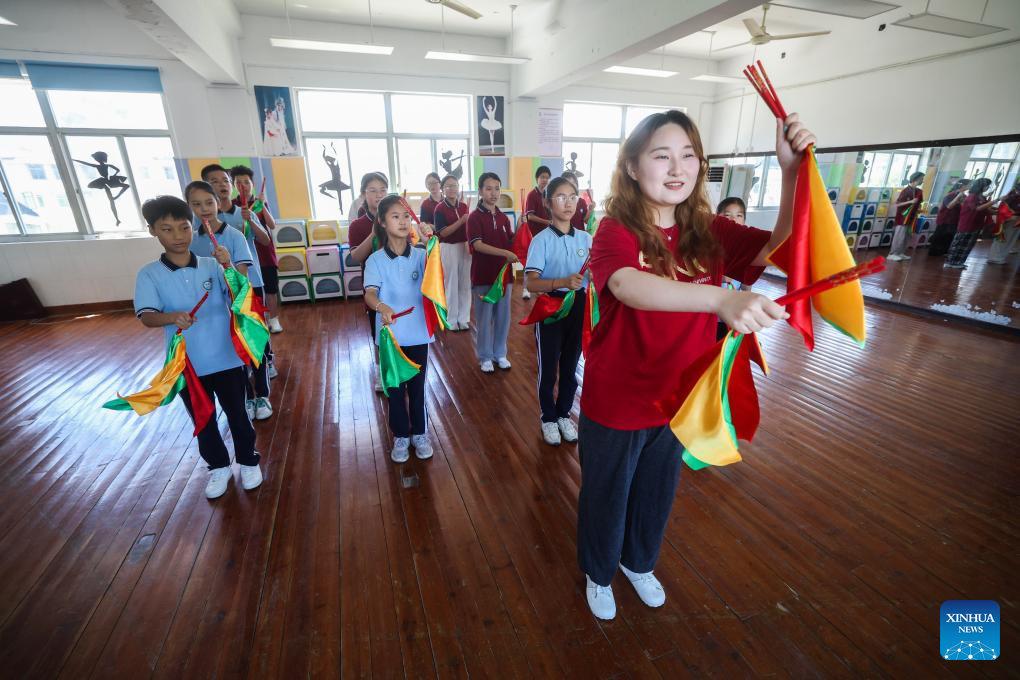 A student from the East China Normal University teaches children to dance at the Donghe Township central school in Donghe Township, Zhuji City of east China's Zhejiang Province, July 1, 2025. Summer camps themed on cultural promotion have been launched here, to enrich summer vocation activities for local students. (Xinhua/Xu Yu)