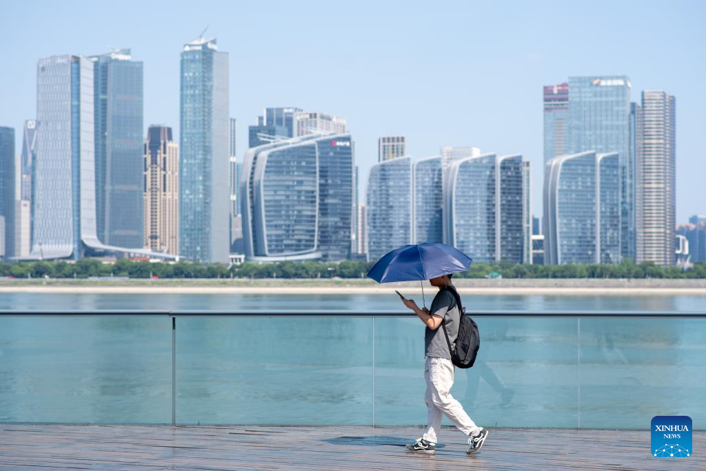 Tourists visit Qianjiang New City in Hangzhou, east China's Zhejiang Province, July 3, 2025. Hangzhou issued an orange heat alert on Thursday. (Xinhua/Jiang Han)