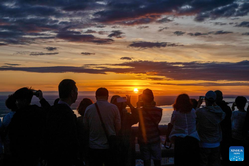 Tourists take photos of the rising sun at Dongji Pavilion in Fuyuan City, northeast China's Heilongjiang Province, July 4, 2025. The Earth passed the aphelion on July 4, which is the time of year when the Earth is farthest from the sun, and the apparent diameter of the sun is the smallest in the year. (Xinhua/Zhang Tao)