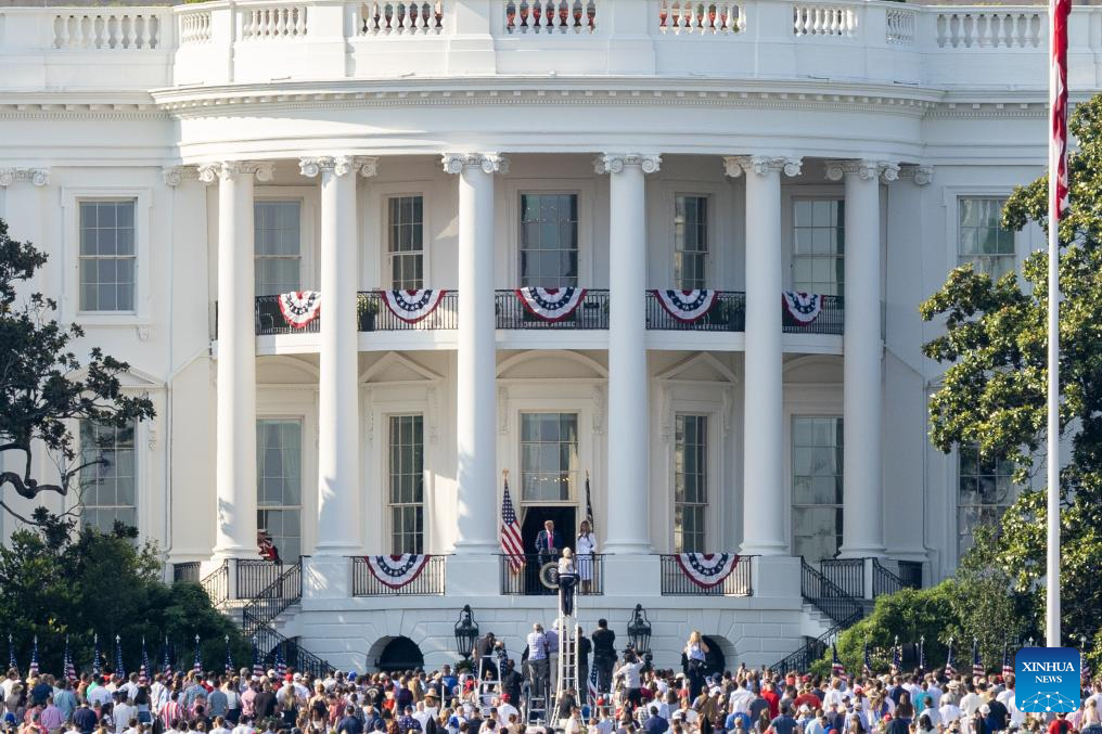 U.S. President Donald Trump speaks on the balcony of the White House in Washington, D.C., the United States, on July 4, 2025. Trump signed his landmark policy bill, the One Big Beautiful Bill, into law on Friday afternoon. (Xinhua/Hu Yousong)