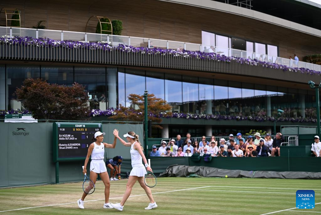 Zhang Shuai (L)/Ekaterina Alexandrova celebrate during the women's doubles second round match between Zhang Shuai (China)/Ekaterina Alexandrova (Russia) and Hozumi Eri (Japan)/Aldila Sutjiadi (Indonesia) at the Wimbledon Tennis Championships in London, Britain, July 4, 2025. (Xinhua/Li Ying)