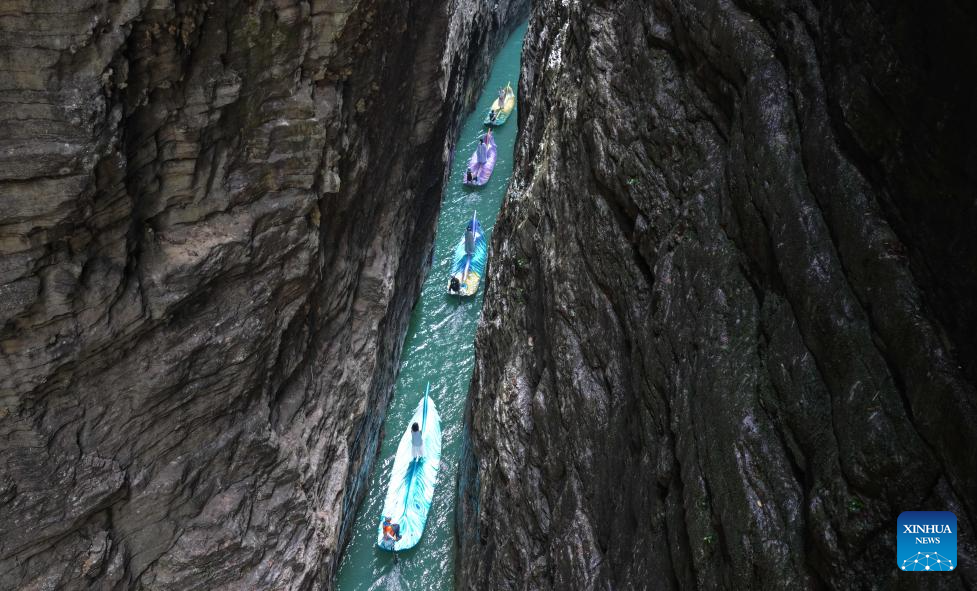 Tourists take feather-shaped boats at Pingshan scenic spot in Hefeng County, Enshi Tujia and Miao Autonomous Prefecture, central China's Hubei Province, July 3, 2025. (Photo by Yang Shunpi/Xinhua)