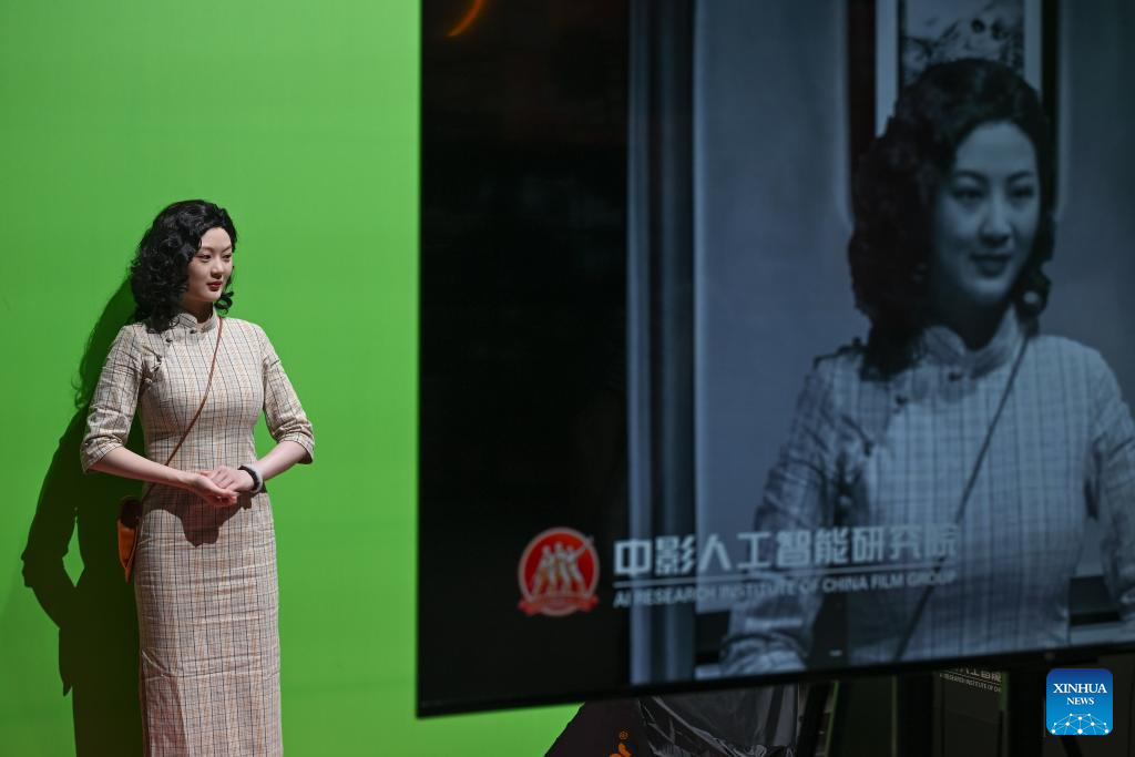 A staff member demonstrates AI face-changing technology at the Yongchuan International Convention and Exhibition Center in southwest China's Chongqing, July 4, 2025. The 2025 SCO (the Shanghai Cooperation Organization) Film Festival takes place from July 3 to 7 here, attracting filmmakers from Russia, Belarus, Pakistan and other SCO member states to present their country's films. The event also gathered over 40 domestic film enterprises to present the latest advancements in film technology and production. (Xinhua/Chen Cheng)