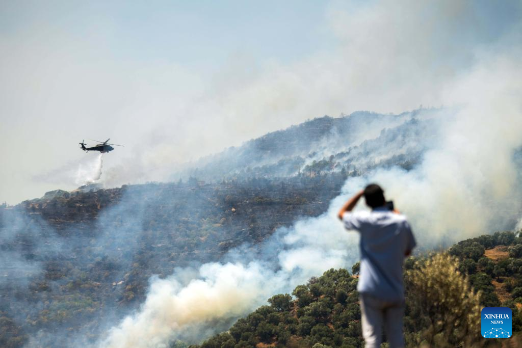 A helicopter puts out a fire in the Odemis district of Izmir, Türkiye, on July 4, 2025. Wildfires that have been raging since Wednesday across three districts in Türkiye's western Izmir province have claimed two lives as firefighters battle flames fueled by strong winds, low humidity, and scorching heat. (Mustafa Kaya/Handout via Xinhua)