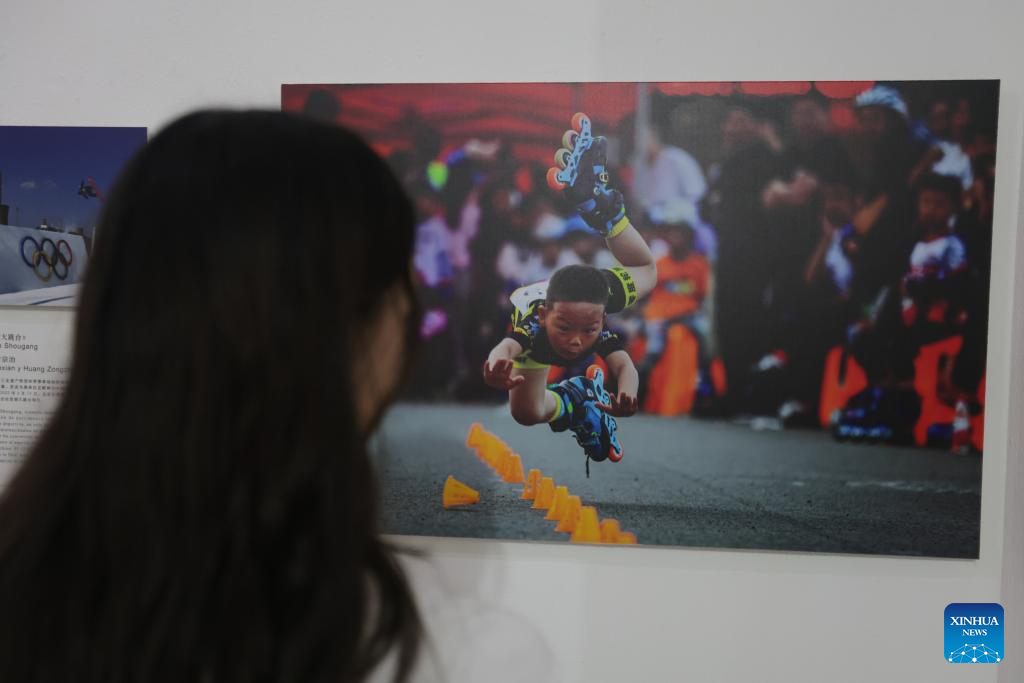 A visitor views exhibits at the "China Story" photo exposition held in Tlalnepantla, Mexico, July 5, 2025. The "China Story" photo exposition, which kicked off here on Saturday, showcases 40 groups of images revealing the beauty of Chinese landscapes and the depth of Chinese culture, offering local audiences a vivid window into modern China. (Photo by Francisco Canedo/Xinhua)
