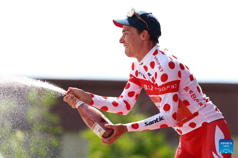 Simon Pellaud of Li Ning Star celebrates in the polka-dot jersey on the podium after Stage 2 of the Tour of Magnificent Qinghai International Road Cycling Race from Duoba to Huzhu, northwest China's Qinghai Province, July 7, 2025. (Xinhua/Zhang Long)