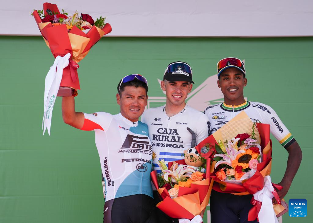 First placed Guillermo Thomas Silva Coussan (C) of Caja Rural-Seguros RGA, second placed Jonathan Klever Caicedo Cepeda (L) of Petrolike and third placed Henok Mulueberhan of XDS Astana Team pose on the podium after Stage 2 of the Tour of Magnificent Qinghai International Road Cycling Race from Duoba to Huzhu, northwest China's Qinghai Province, July 7, 2025. (Xinhua/Qi Zhiyue)