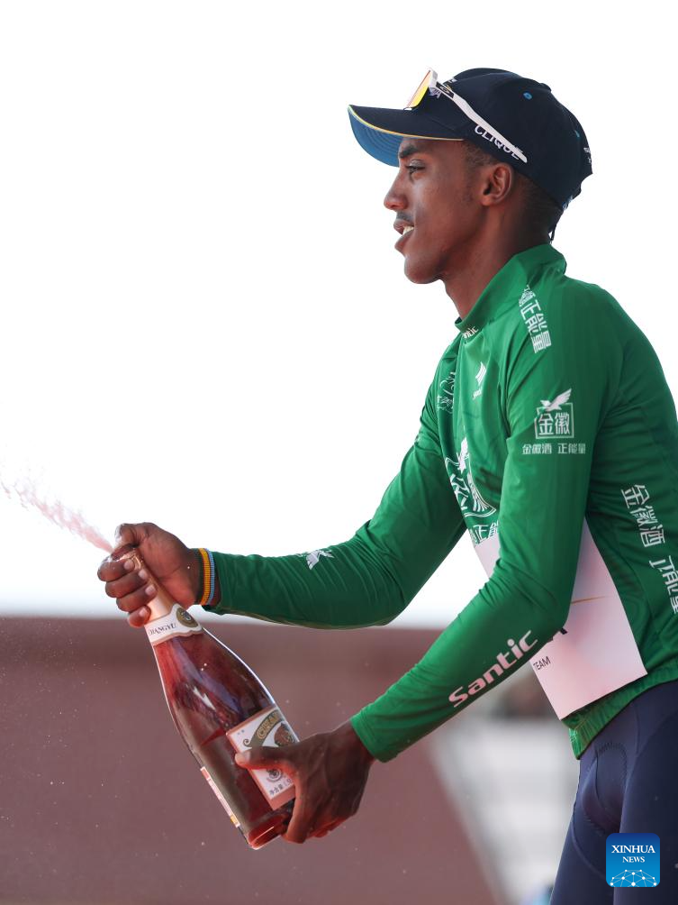 Solomon Henok Mulueberhan of XDS Astana Team celebrates in the green jersey on the podium after Stage 2 of the Tour of Magnificent Qinghai International Road Cycling Race from Duoba to Huzhu, northwest China's Qinghai Province, July 7, 2025. (Xinhua/Zhang Long)