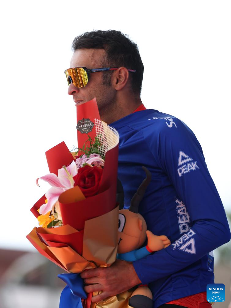Saeid Safarzadeh of Tianyoude Hotel Cycling Team celebrates in the blue jersey on the podium after Stage 2 of the Tour of Magnificent Qinghai International Road Cycling Race from Duoba to Huzhu, northwest China's Qinghai Province, July 7, 2025. (Xinhua/Zhang Long)