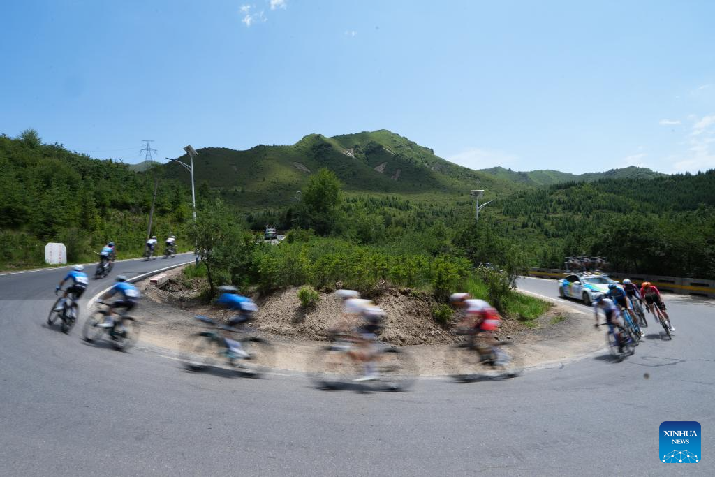 Cyclists compete during Stage 2 of the Tour of Magnificent Qinghai International Road Cycling Race from Duoba to Huzhu, northwest China's Qinghai Province, July 7, 2025. (Xinhua/Zhang Long)