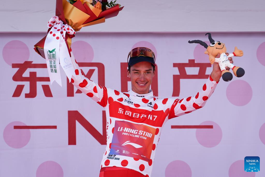 Simon Pellaud of Li Ning Star celebrates in the polka-dot jersey on the podium after Stage 2 of the Tour of Magnificent Qinghai International Road Cycling Race from Duoba to Huzhu, northwest China's Qinghai Province, July 7, 2025. (Xinhua/Qi Zhiyue)