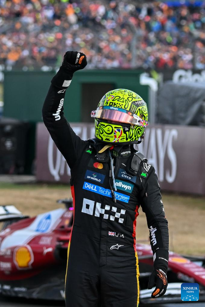 McLaren's British driver Lando Norris celebrates after winning the Formula One British Grand Prix 2025 at the Silverstone Circuit in London, Britain, July 6, 2025. (Xinhua/Wu Lu)