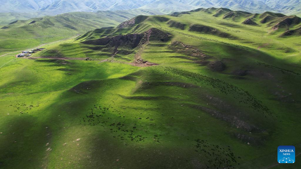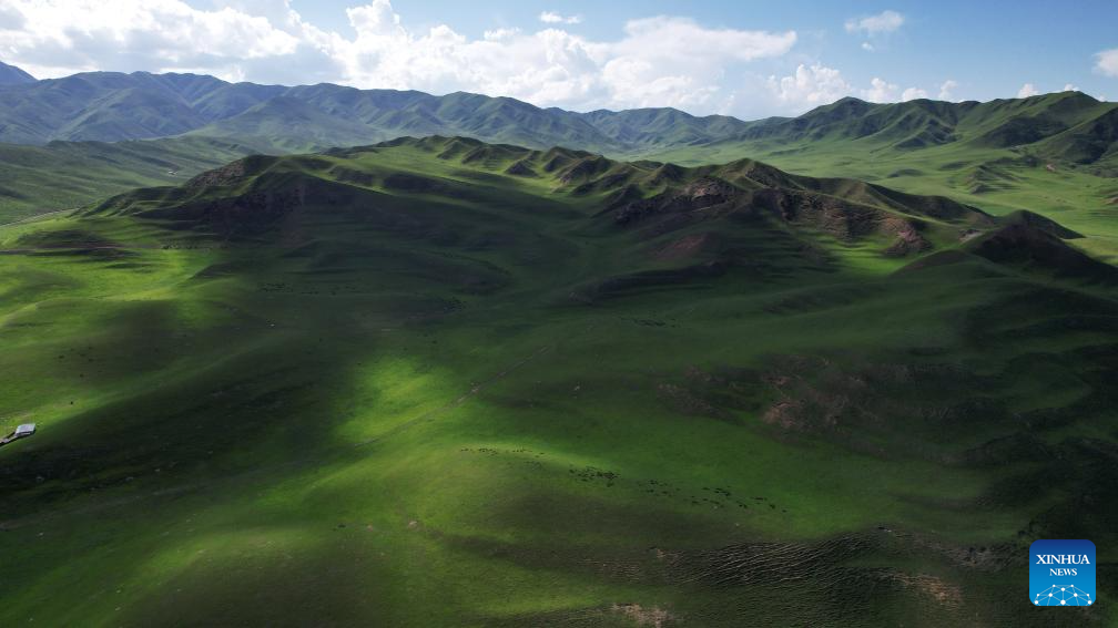 An aerial drone photo taken on July 10, 2025 shows the scenery of the Sangke Grassland in Xiahe County, Gannan Tibetan Autonomous Prefecture, northwest China's Gansu Province. (Xinhua/Yu Lan)