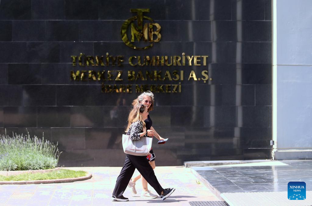 People walk past Türkiye's central bank in Ankara, Türkiye, on July 11, 2025. The Turkish central bank is expected to lower interest rates to support economic activity at its July 24 monetary policy meeting amid cooling inflation, experts and monetary bodies have said. (Mustafa Kaya/Handout via Xinhua)