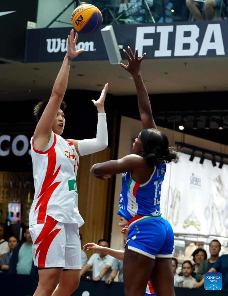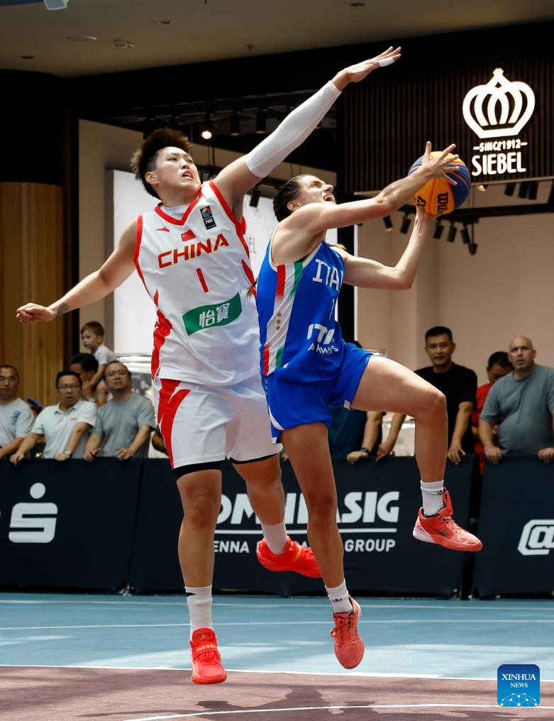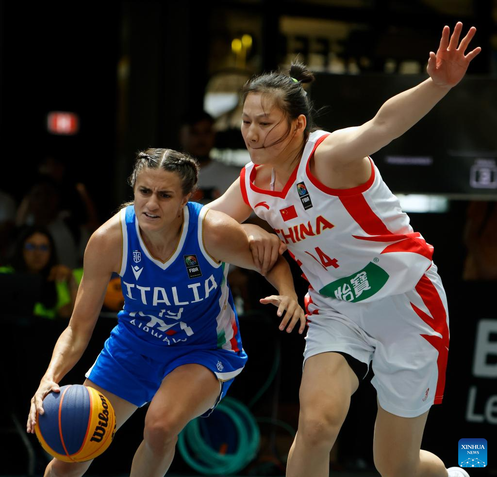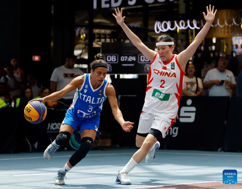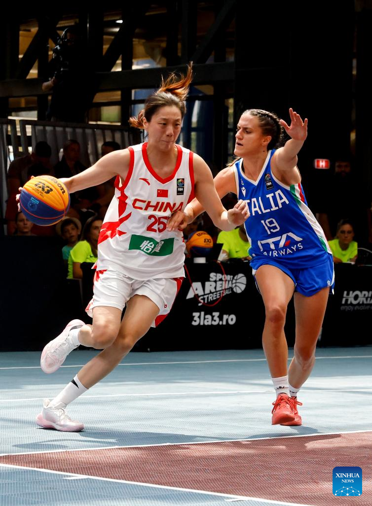 Zhou Mengyun (R) of China vies with Sofia Frustaci of Italy during the FIBA 3X3 Women's Series basketball match between China and Italy in Bucharest, Romania, July 12, 2025. (Photo by Cristian Cristel/Xinhua)
