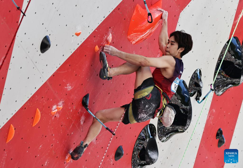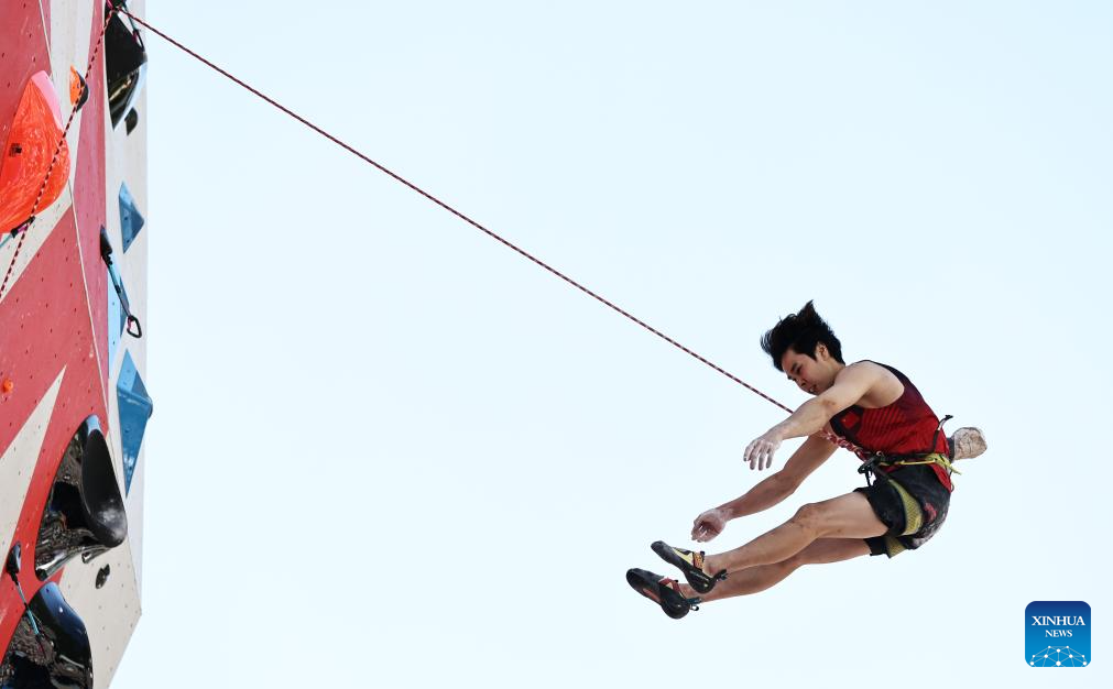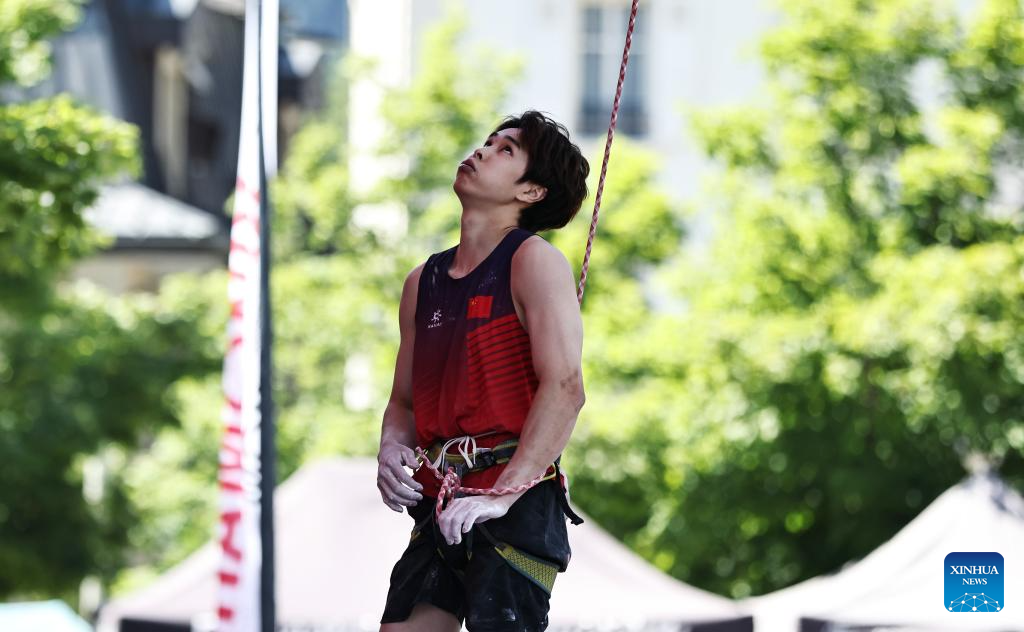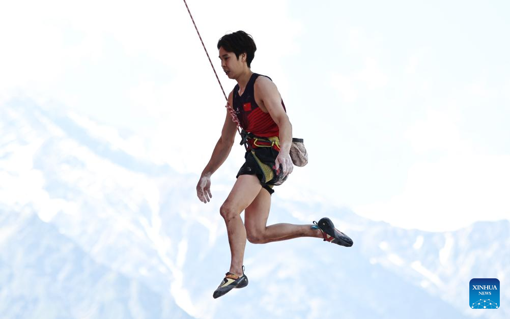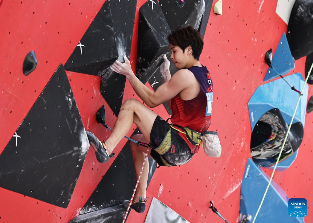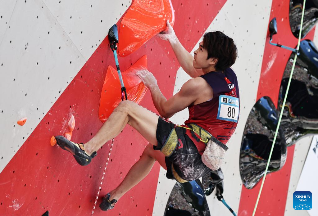 Pan Yufei of China competes during the men's lead qualification of sport climbing at the 2025 IFSC Climbing World Cup Speed-Lead in Charmonix, France, July 12, 2025. (Xinhua/Gao Jing)