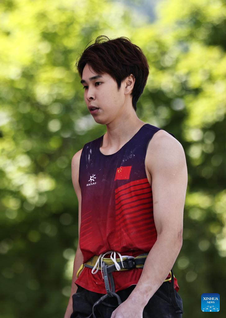Pan Yufei of China reacts during the men's lead qualification of sport climbing at the 2025 IFSC Climbing World Cup Speed-Lead in Charmonix, France, July 12, 2025. (Xinhua/Gao Jing)