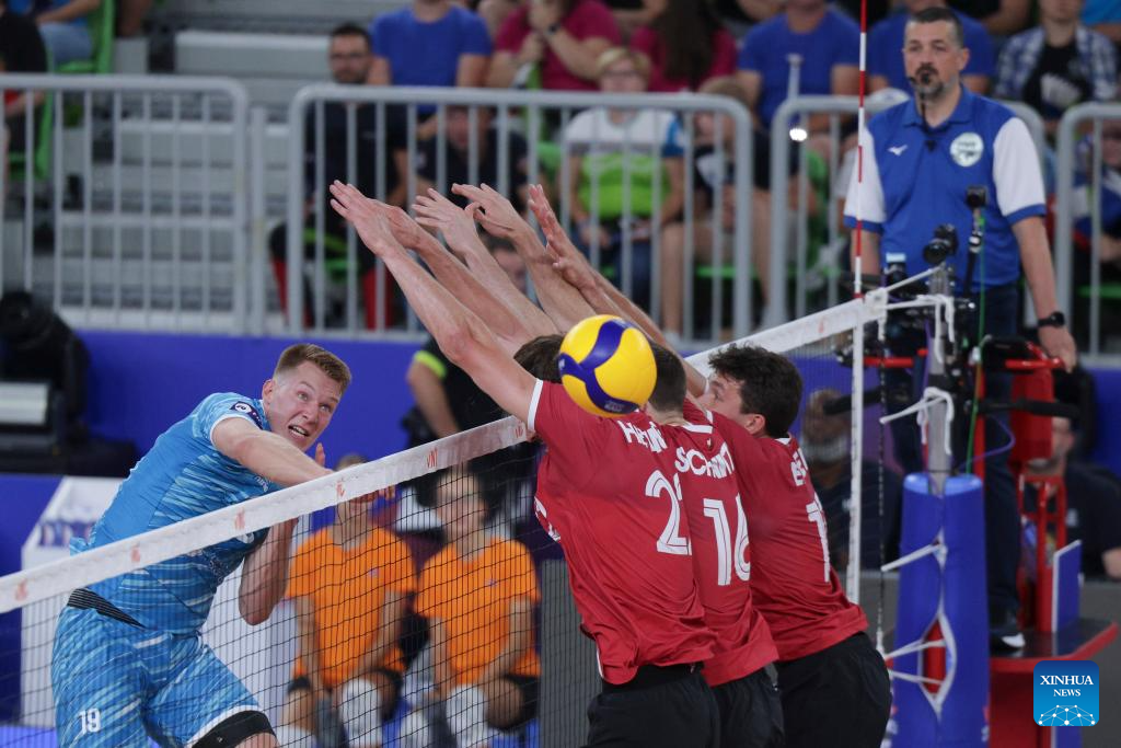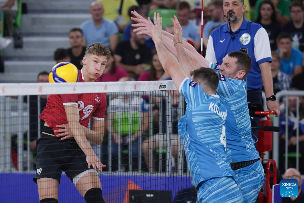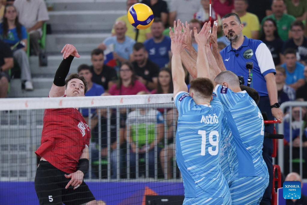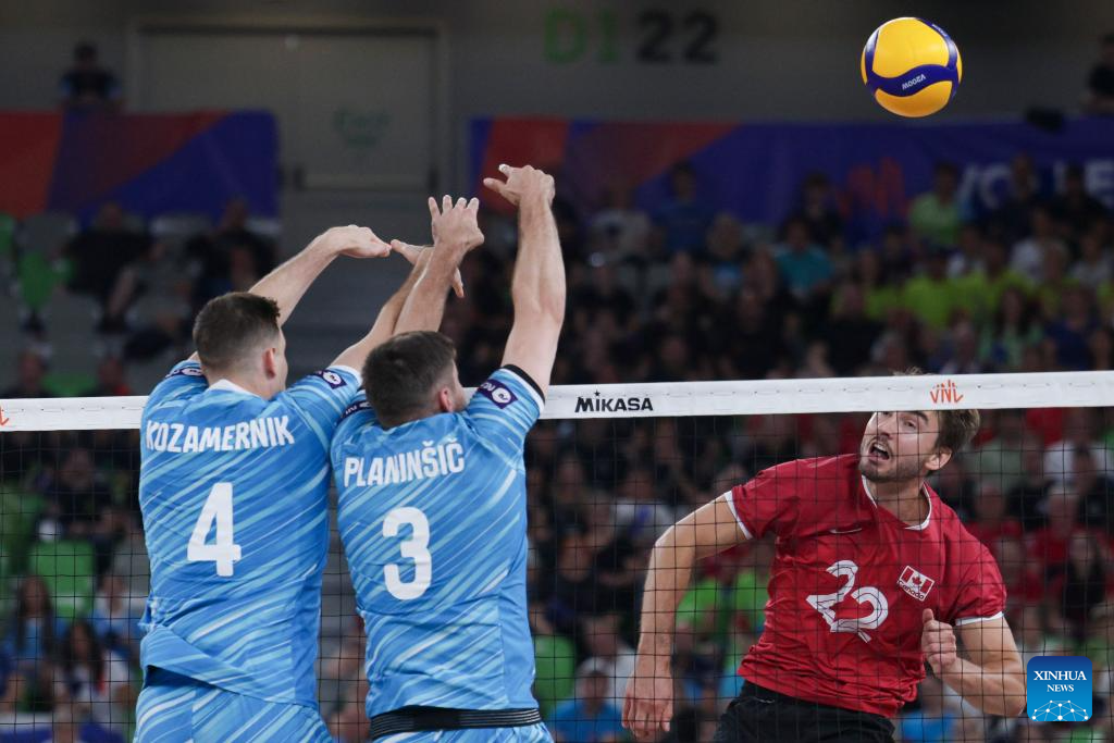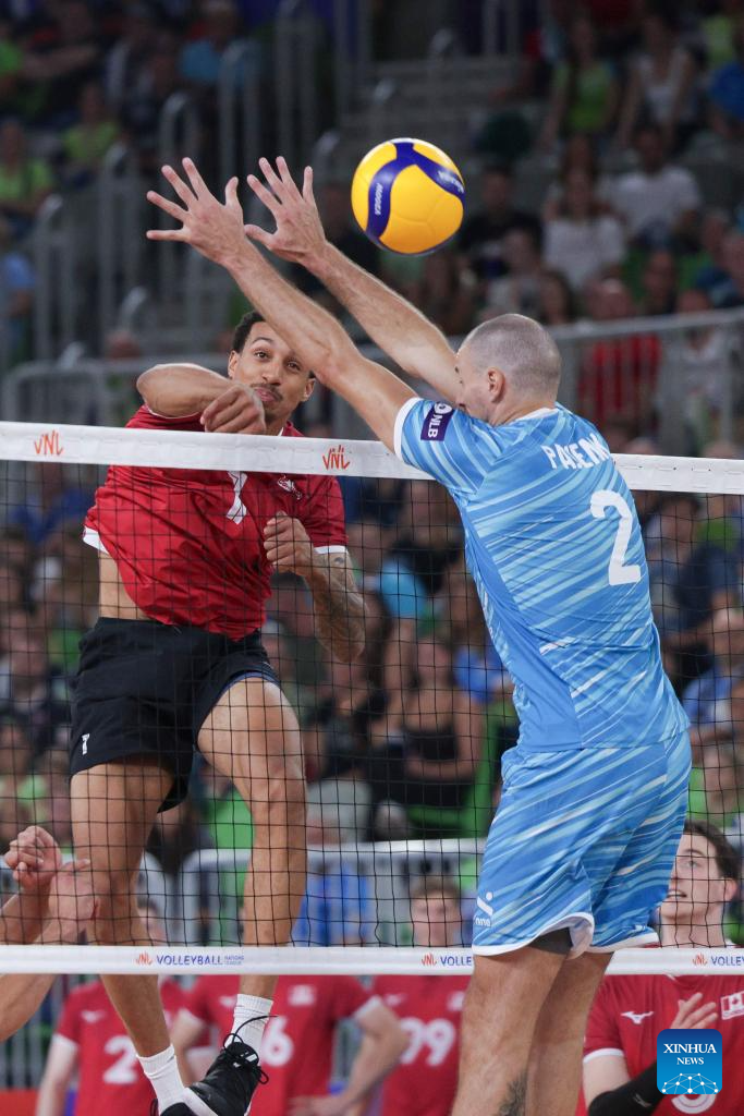 Brodie Hofer (L) of Canada spikes the ball during the Pool 8 match between Canada and Slovenia at the Men's Volleyball National League 2025 in Ljubljana, Slovenia, July 16, 2025. (Photo by Zeljko Stevanic/Xinhua)