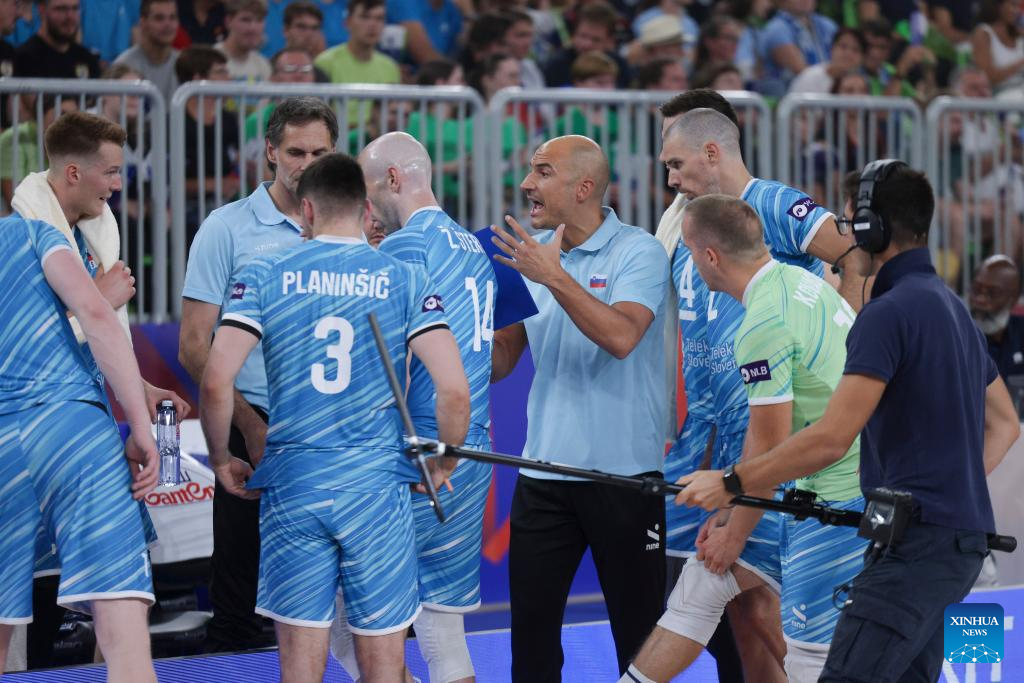 Fabio Soli (C), head coach of Slovenia, instructs the players during the Pool 8 match between Canada and Slovenia at the Men's Volleyball National League 2025 in Ljubljana, Slovenia, July 16, 2025. (Photo by Zeljko Stevanic/Xinhua)