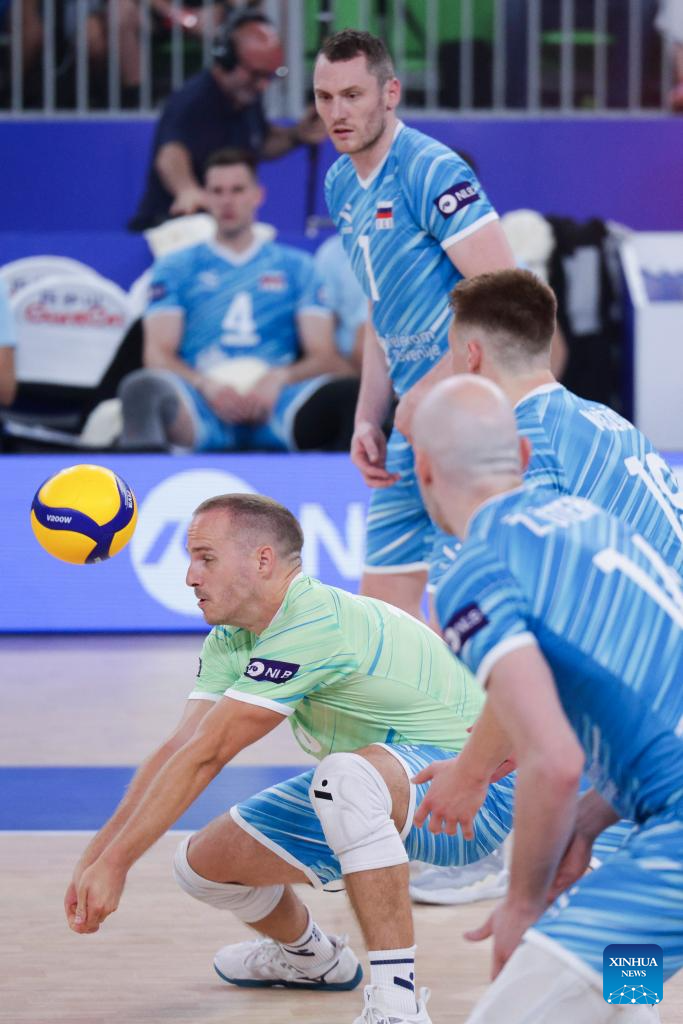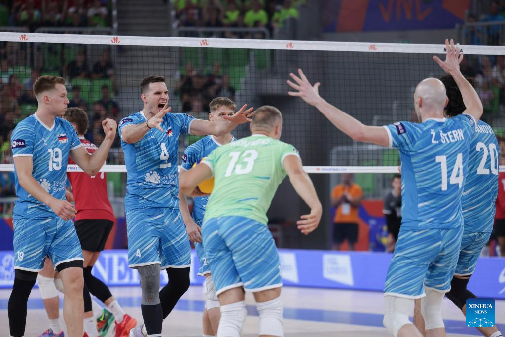 Players of Slovenia celebrate scoring during the Pool 8 match between Canada and Slovenia at the Men's Volleyball National League 2025 in Ljubljana, Slovenia, July 16, 2025. (Photo by Zeljko Stevanic/Xinhua)