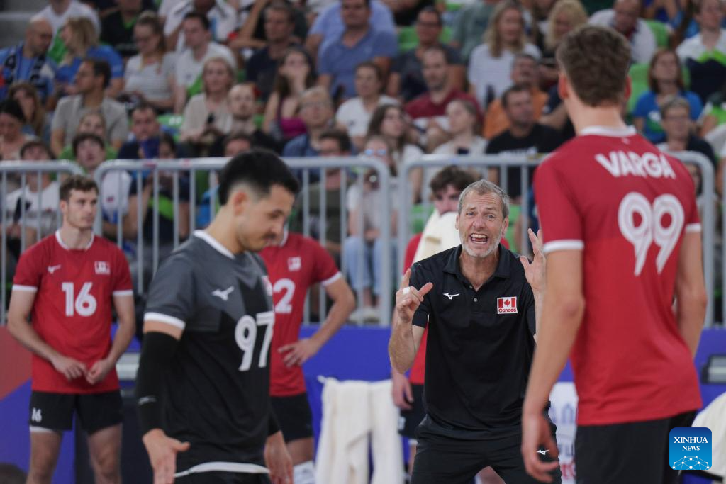 Daniel Lewis (2nd R), the head coach of Canada, instructs players during the Pool 8 match between Canada and Slovenia at the Men's Volleyball National League 2025 in Ljubljana, Slovenia, July 16, 2025. (Photo by Zeljko Stevanic/Xinhua)