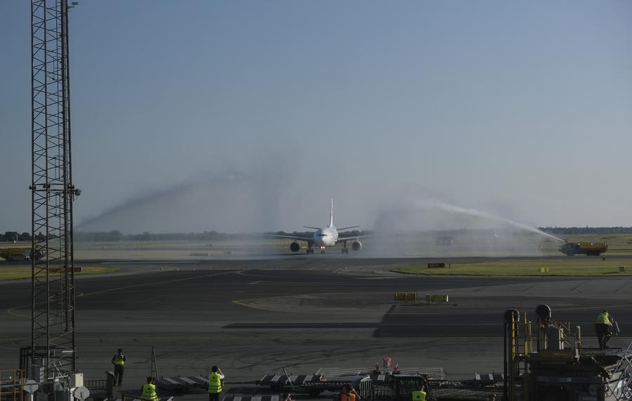 An Airbus A330 aircraft landed at Copenhagen Airport at 7 p.m. local time, where it was greeted with a traditional water salute. After two hours, the return flight departed Copenhagen, carrying over 250 passengers back to Shanghai.