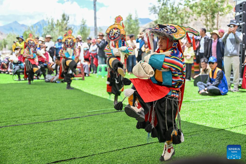 Child actors perform Tibetan opera at a park in Namling County of Xigaze City, southwest China's Xizang Autonomous Region, July 16, 2025. Tibetan opera, an olden art that boasts a history of over six centuries, was listed as a national intangible cultural heritage in 2006. Namling County has stepped up in recent years to further popularize this art by regularly staging plays in the neighborhoods and training more professional performers. To date, the county is home to 29 folk Tibetan opera troupes including 876 practitioners, in addition to a 35-strong children's troupe at an average age of 9. (Xinhua/Li Xin)
