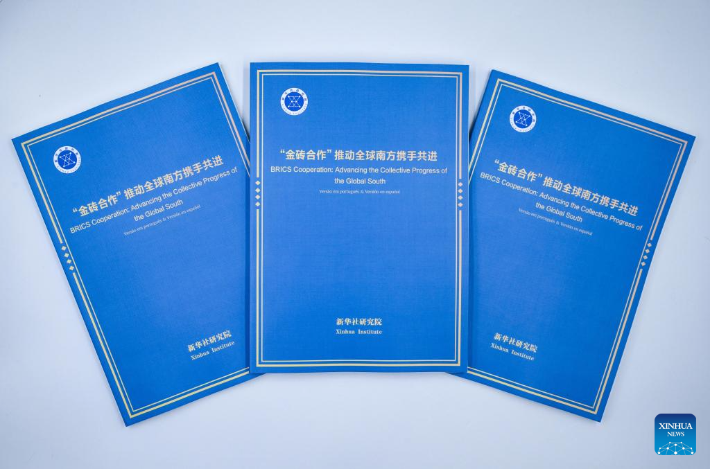 This photo taken on July 15, 2025 shows copies of a report titled "BRICS Cooperation: Advancing the Collective Progress of the Global South" released during the BRICS Media and Think Tank Forum in Rio de Janeiro, Brazil. This report compiled by the Xinhua Institute, a think tank affiliated with Xinhua News Agency, was released during the forum here on Wednesday. (Xinhua/Chen Yehua)