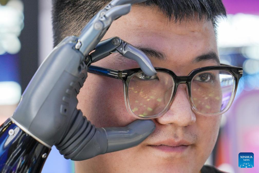 A staff member of technology firm BrainCo uses a smart prosthetic hand to take off his glasses in the Digital Technology Chain area of the third China International Supply Chain Expo (CISCE) in Beijing, capital of China, July 17, 2025. Held from July 16 to 20, the 2025 CISCE kicked off in Beijing on Wednesday. A key innovation for this edition is the "Debut Zone," dedicated to the global premieres of new products, technologies, and ecosystems, showcasing breakthrough innovations that drive industrial collaboration. (Xinhua/Ju Huanzong)