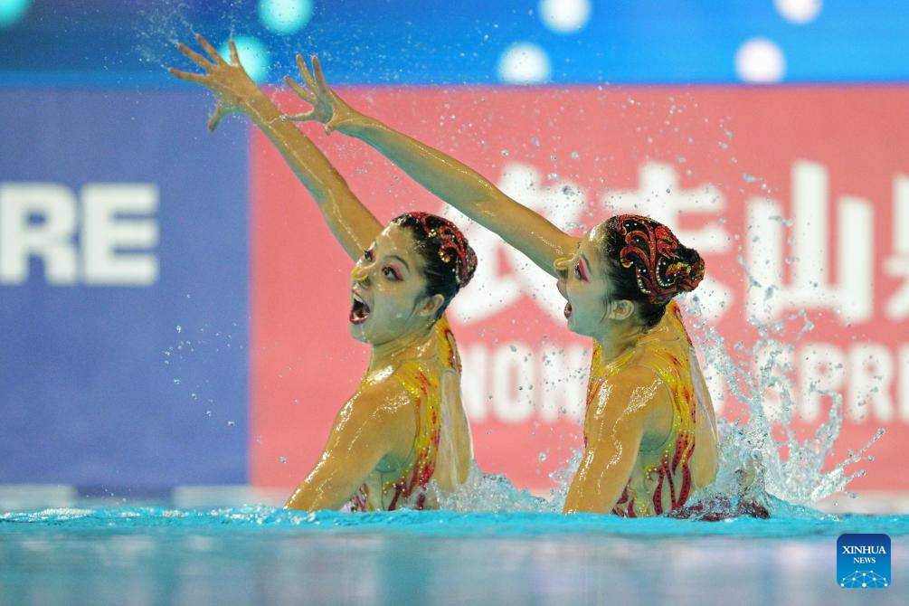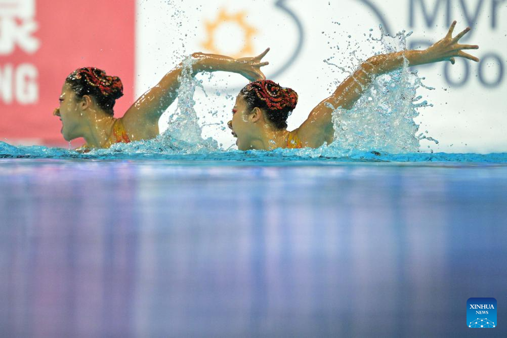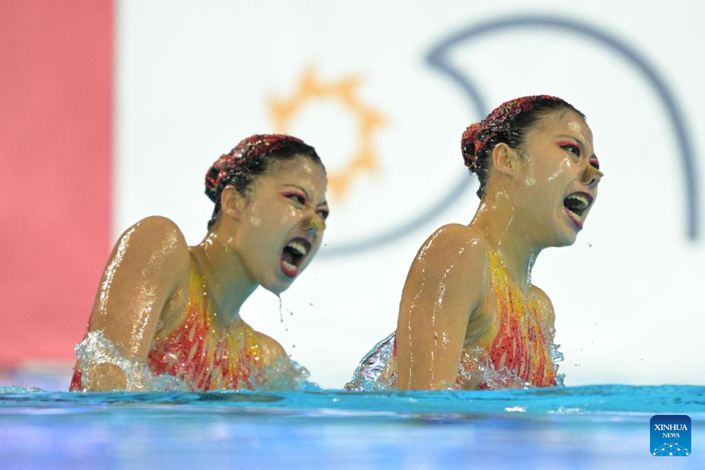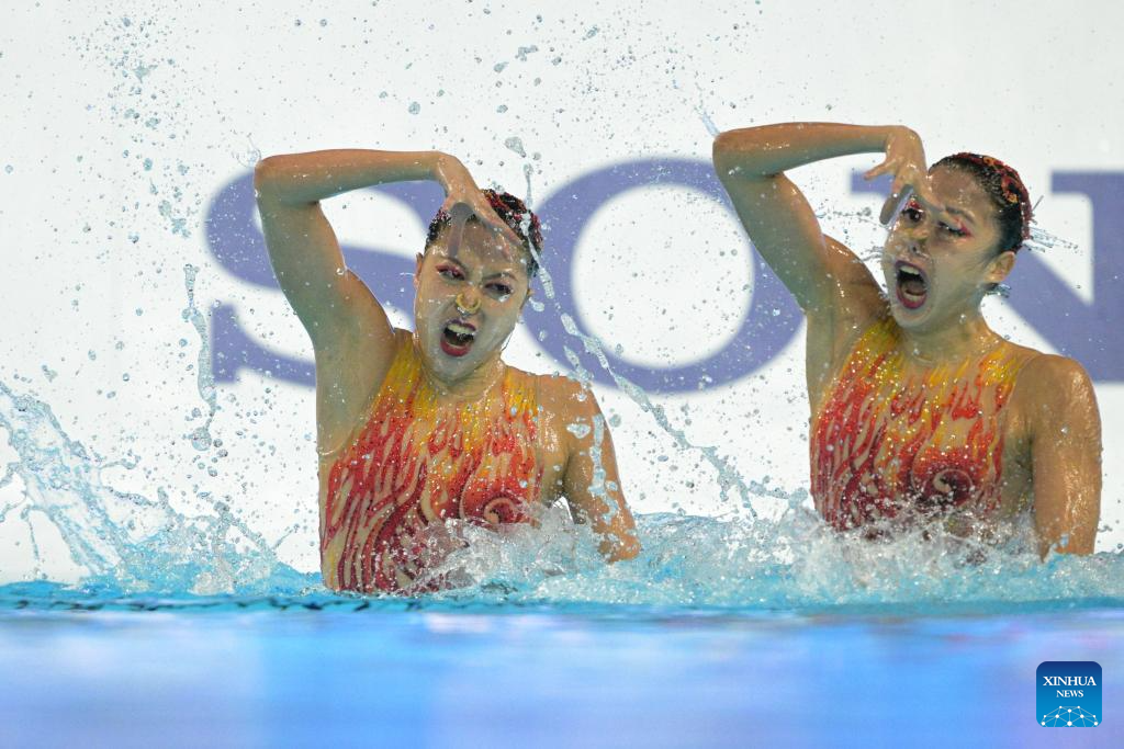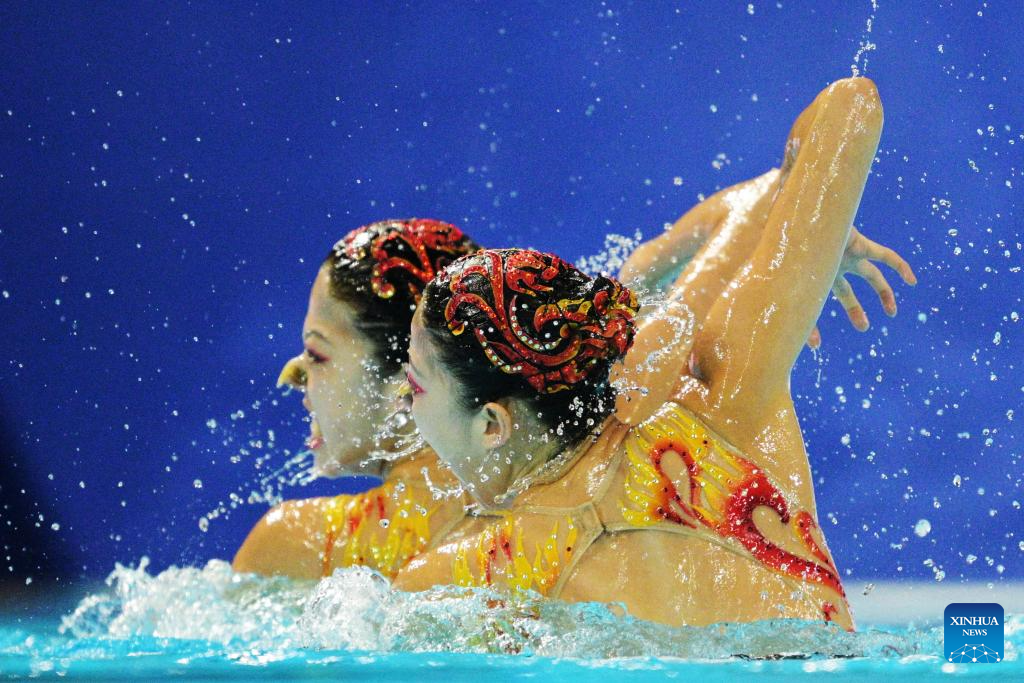 Lin Yanhan/Lin Yanjun of China compete during the women's duet technical preliminary of artistic swimming at the World Aquatic Championships in Singapore, July 18, 2025. (Photo by Then Chih Wey/Xinhua)