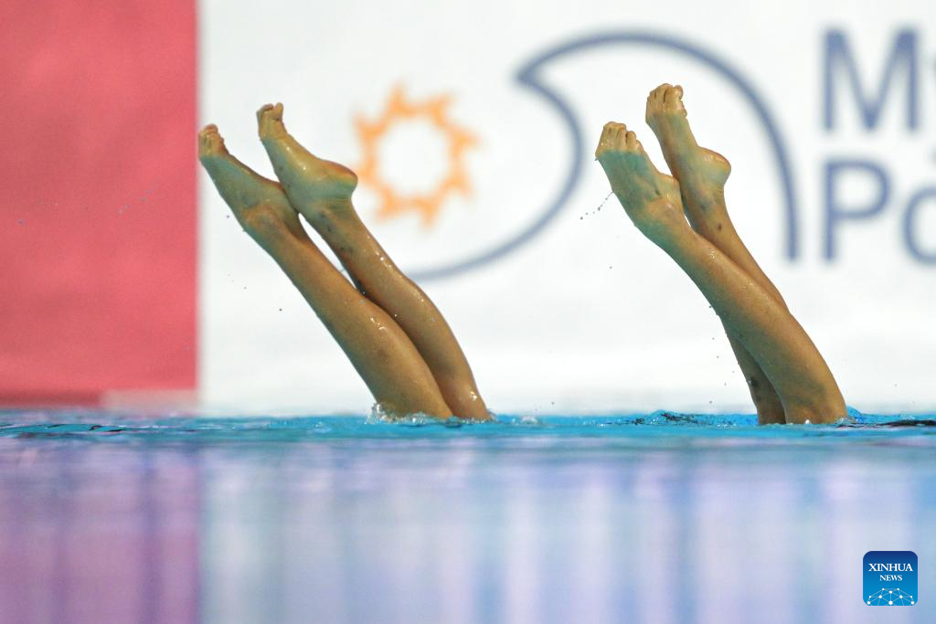 Chu Ka Wing Katherine/Hung Sze Ching of China's Hong Kong compete during the women's duet technical preliminary of artistic swimming at the World Aquatic Championships in Singapore, July 18, 2025. (Photo by Then Chih Wey/Xinhua)