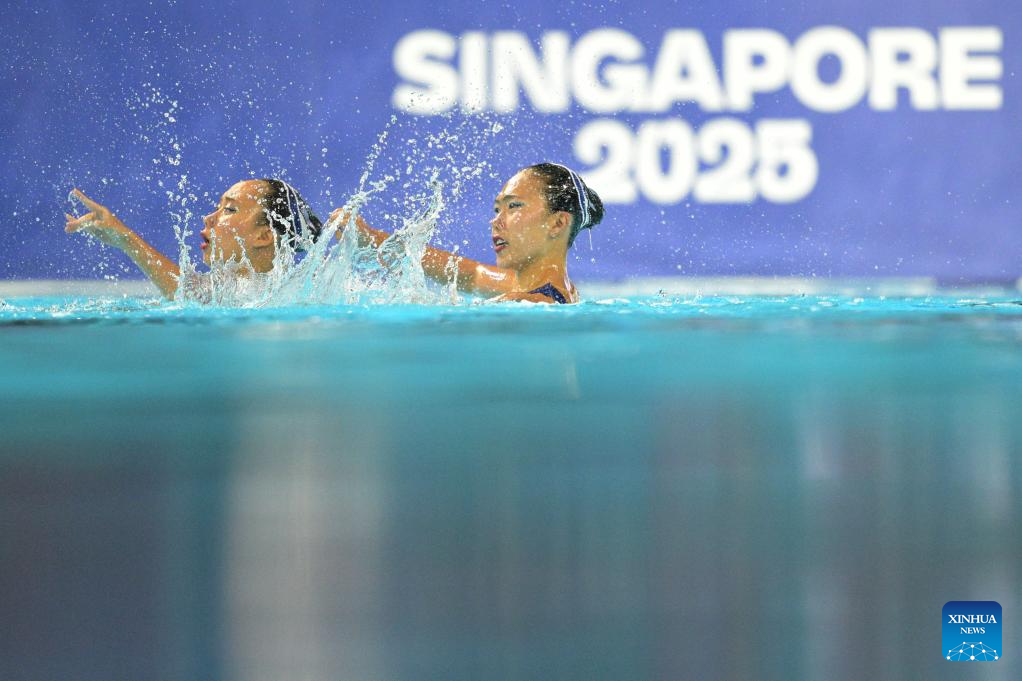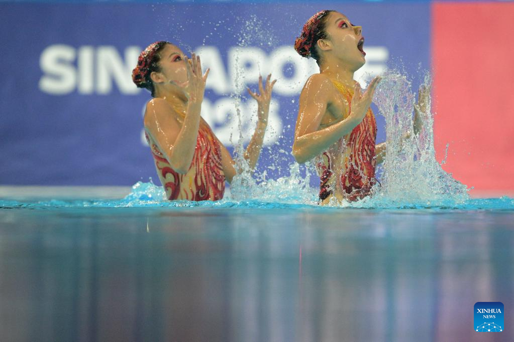 Yvette Ann Chong/Debbie Soh of Singapore compete during the women's duet technical preliminary of artistic swimming at the World Aquatic Championships in Singapore, July 18, 2025. (Photo by Then Chih Wey/Xinhua)