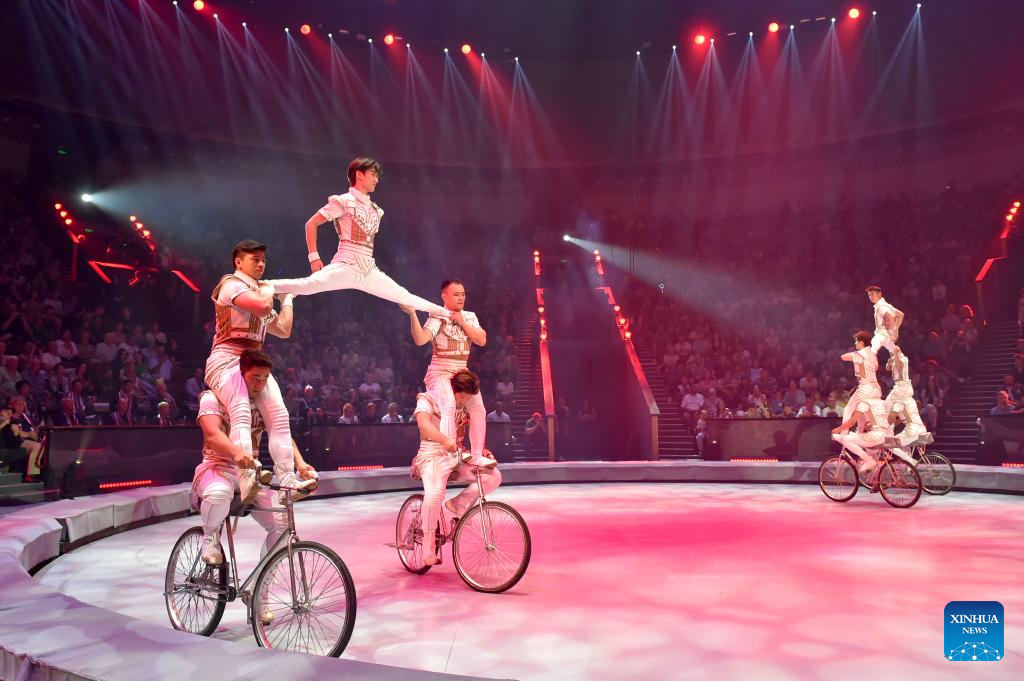 Artists from China perform during the World Circus Art Festival "IDOL-2025" in Moscow, Russia, on July 17, 2025. The festival is held here from July 17 to 20. (Photo by Alexander Zemlianichenko Jr/Xinhua)