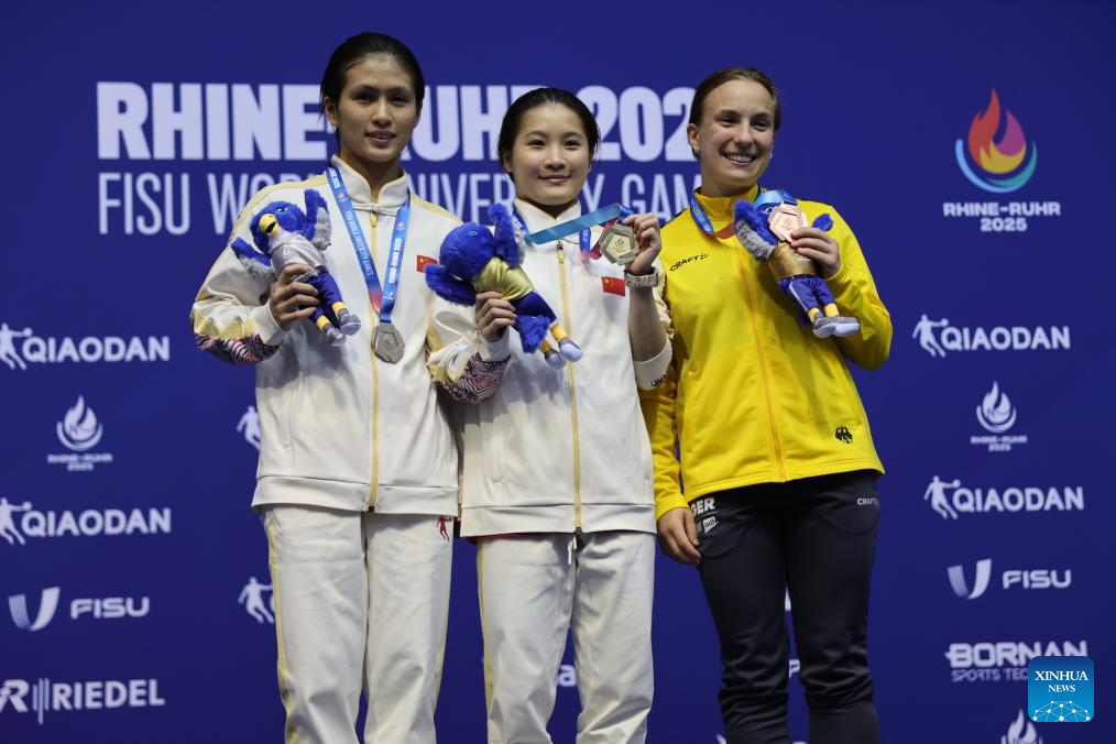 (250722) -- BERLIN, July 22, 2025 (Xinhua) -- Gold medalist Wang Weiying (C) of China, silver medalist Qu Zhixin (L) of China and bronze medalist Lena Hentschel of Germany pose during the awarding ceremony after the women's 3m springboard final of diving at the Rhine-Ruhr 2025 FISU World University Games in Berlin, Germany, July 21, 2025. (Xinhua/Du Zheyu)
